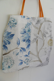 Here is another tote made with sample upholstery fabric with handles made from a belt I purchased from Good Will for .50. The belt handles are cream on one side and pink on the other which pairs nicely with the soft pink in the rose fabric.